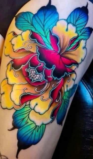 Close-up of a vibrant, detailed thigh tattoo featuring floral and geometric patterns on smooth skin.